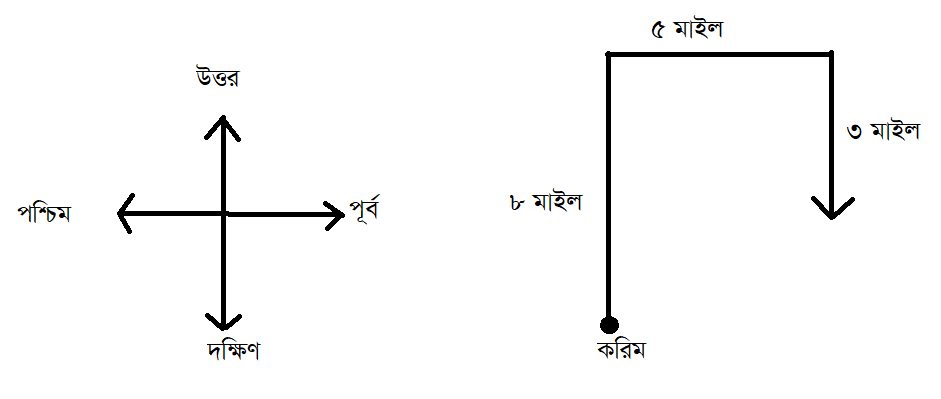 করিম উত্তর দিকে ৮ মাইল হেঁটে ডানদিকে ঘুরে ৫ মাইল হাঁটেন। তারপর ডানদিকে ঘুরে ৩ মাইল হাঁটেন। তিনি কোন দিকে হাঁটছেন?