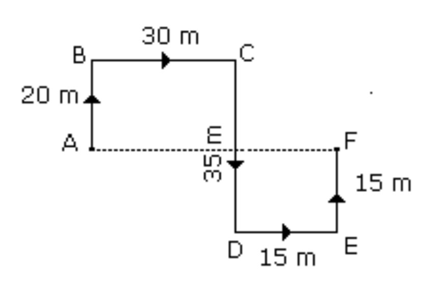 আবির উত্তর দিকে ২০ মিটার হাঁটলো। তারপর সে ডানদিকে ঘুরলো এবং 30 মিটার হাঁটলো। তারপরে সে ডানদিকে ঘুরে 35 মিটার হাঁটলো। তারপর সে বাম দিকে ঘুরে 15 মিটার হাঁটে। অবশেষে সে বাম দিকে ঘুরে 15 মিটার হাঁটলো। শুরুর অবস্থান থেকে সে কোন দিকে এবং কত দূরে আছে?