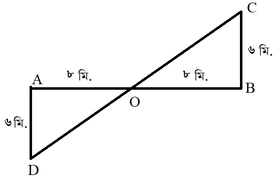 দুই জন লোক একই জায়গা থেকে যাত্রা শুরু করে পরস্পর বিপরীত দিকে ৮ মিটার হেঁটে গেল। তারপর তারা বাম দিকে ঘুরে আরও ৬ মিটার হেঁটে গেল। তাদের দুই জনের মধ্যে সরাসরি দূরত্ব কত?